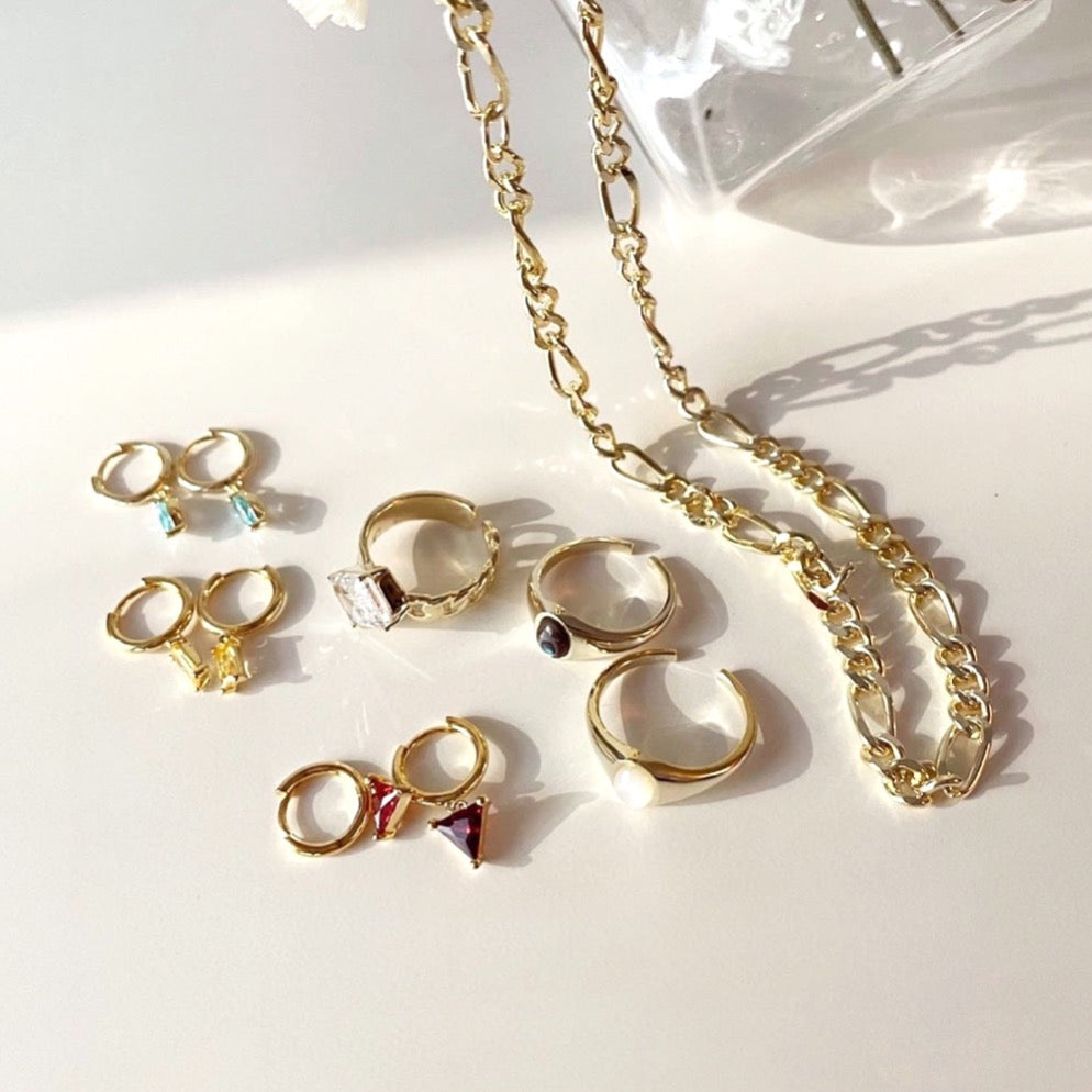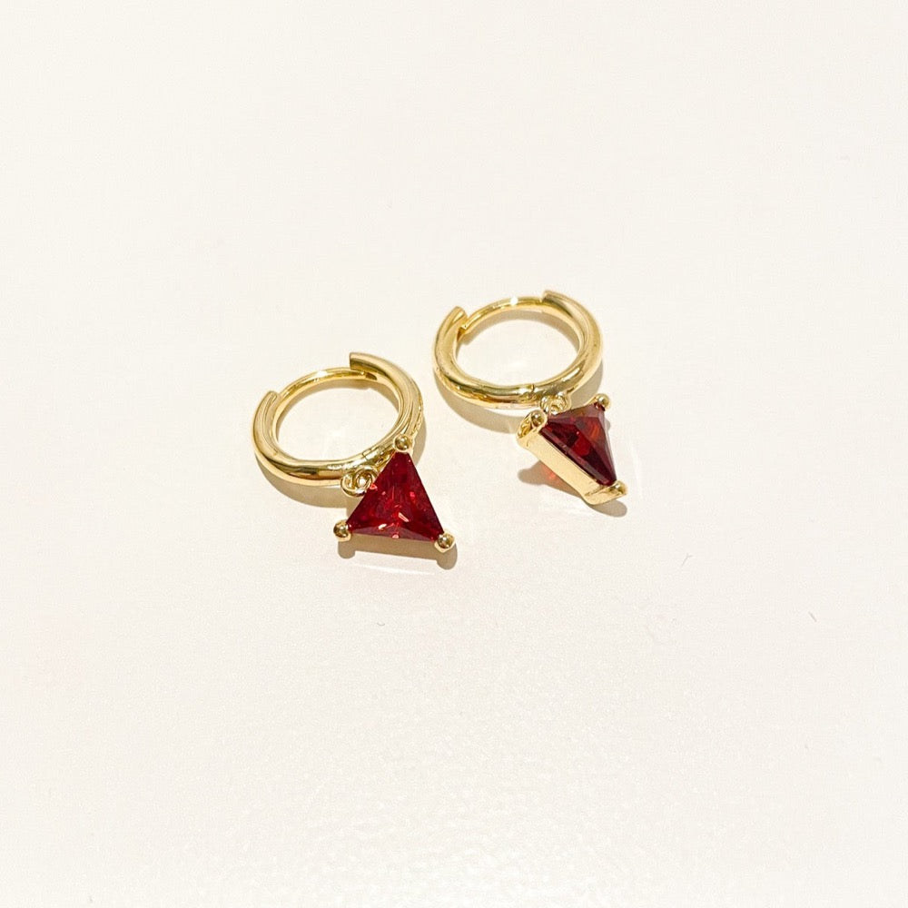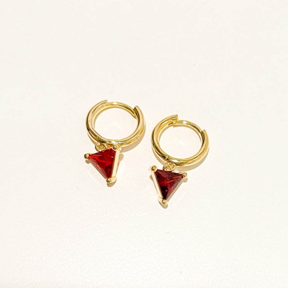 These mini hoops are the perfect Spring/Summer earrings to add a pop of colour to your ear stack. The unique triangle shape in a rich ruby red, gives a bold and edgy look and feel.