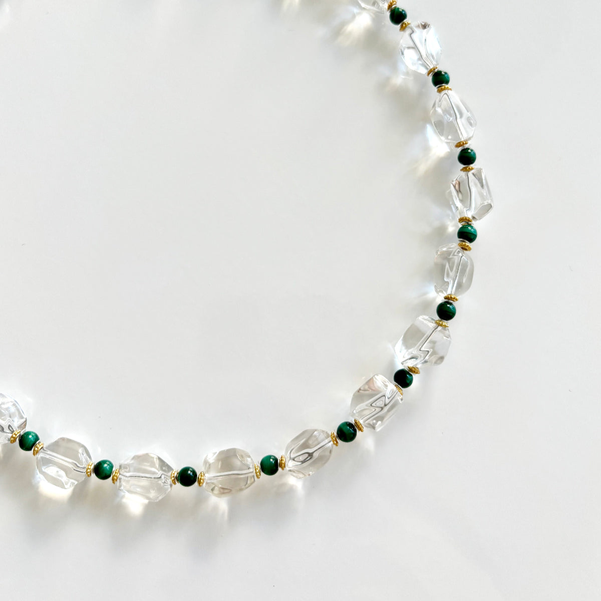 Bold geometric-cut clear quartz meets delicate green beads in a necklace that instantly elevates any look. The sharp, light-catching quartz brings a modern edge, while the green accents add a hint of natural warmth. Whether layered or worn solo, it’s the kind of piece that turns everyday style into something unforgettable.